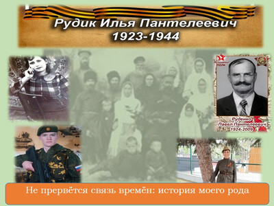 Мой дядя, Рудик Илья Пантелеевич, с первых дней войны вступил в ряды Красной Армии, где проявил себя как доблест