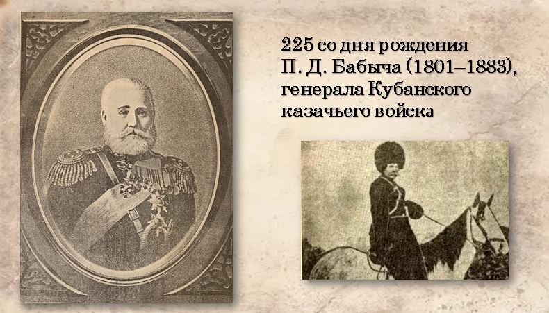 Павел Денисьевич Бабыч — один из ярчайших представителей казачьей военной аристократии XIX века — родился 15 января 1801 года в семье дворян Черноморского казачьего войска. Скромно начав службу рядовым казаком в 1819 году, он с первых шагов проявил редкое сочетание мужества, ума и преданности долгу — качества, что вскоре открыли ему путь ввысь по слу