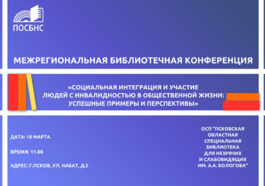 18 марта 2026 года в Пскове состоялась межрегиональная конференция «Социальная интеграция и участие людей с инвалидностью в общественной жизни: успешные примеры и перспективы». Организатором мероприятия выступило ОСП «Псковская областная специальная библиотека для незрячих и слабовидящих им. А. А. Бологова» при поддержке Министерс